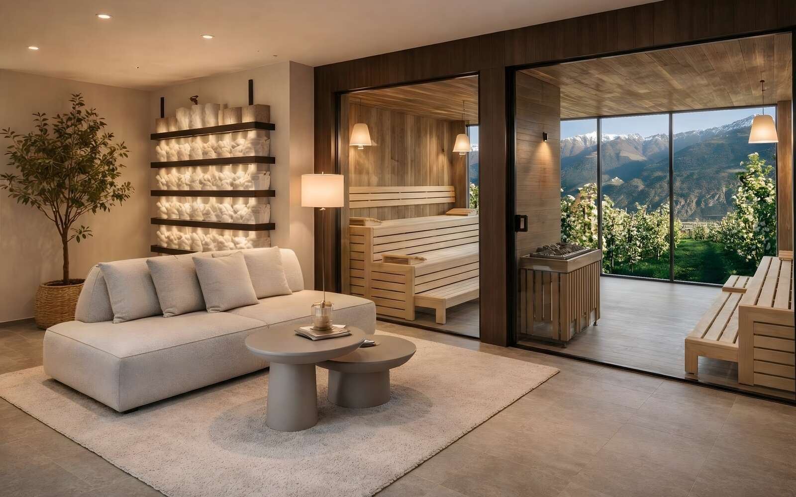 Mitten im Grünen, umgeben von Apfelwiesen und mit freiem Blick in die Berge, steht unser großzügiges Spa-Haus: The Soul House. Ein Ort für alle, die Wasser, Wärme und Weite lieben. Ein Infinity-Outdoorpool, der scheinbar in die Landschaft übergeht. Ein Panorama-Ruheraum mit Blick ins Tal. Drei verschiedene Saunen – von finnisch heiß bis bio-sanft. Dampfbad, Kältegang und ein Bewegungsraum, der dich fast automatisch hineinzieht. Und draußen? Ein großzügiger Balkon mit DayBeds und einem Ausblick, der alles andere kurz still werden lässt.