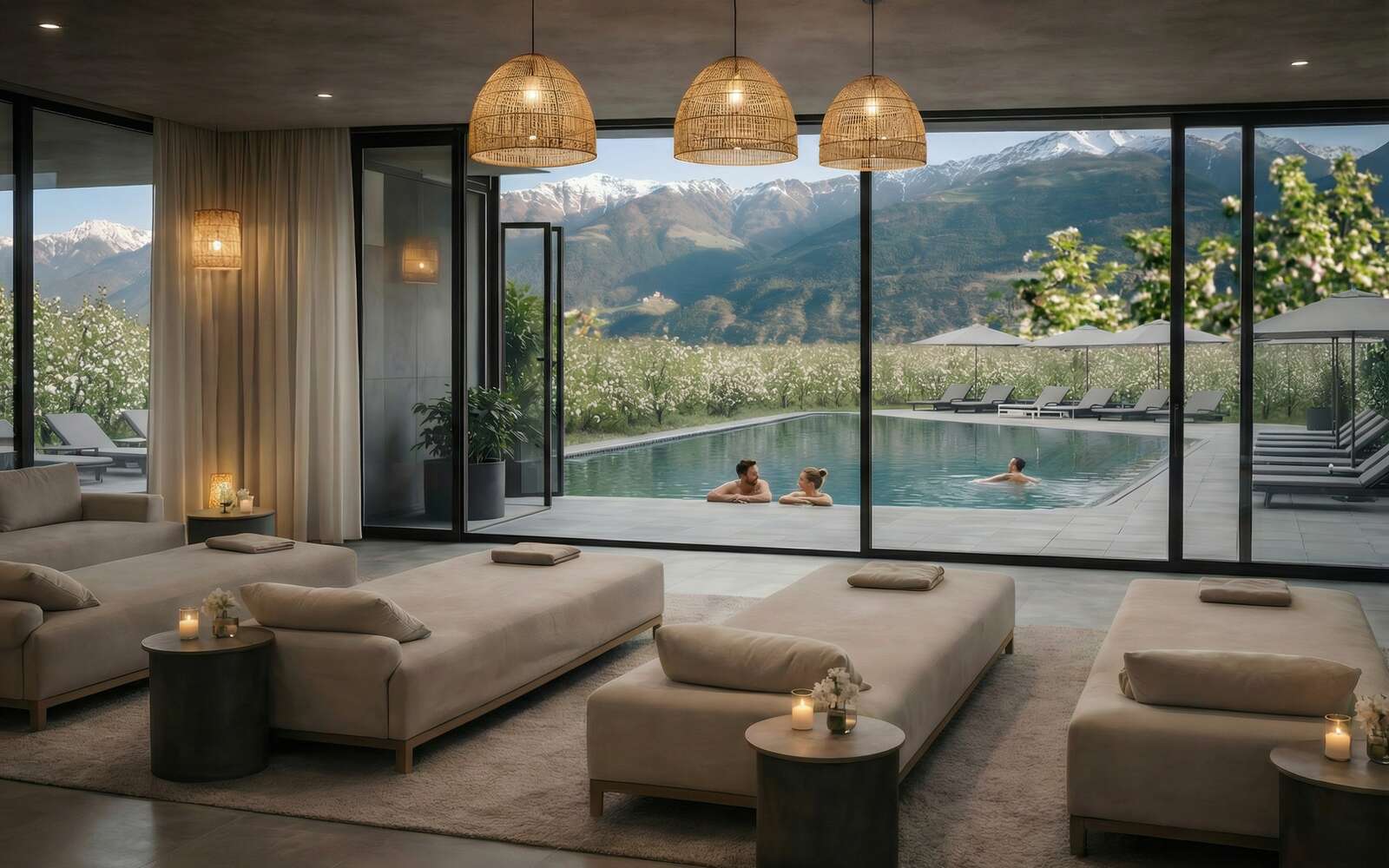 Im Zentrum unseres Gartens liegt er da – unser ganzjährig beheizter Outdoor-Infinity Pool. Mit überdachtem Einstieg, freiem Blick in die Berge und Wasser, das selbst an kühleren Tagen angenehm warm ist.